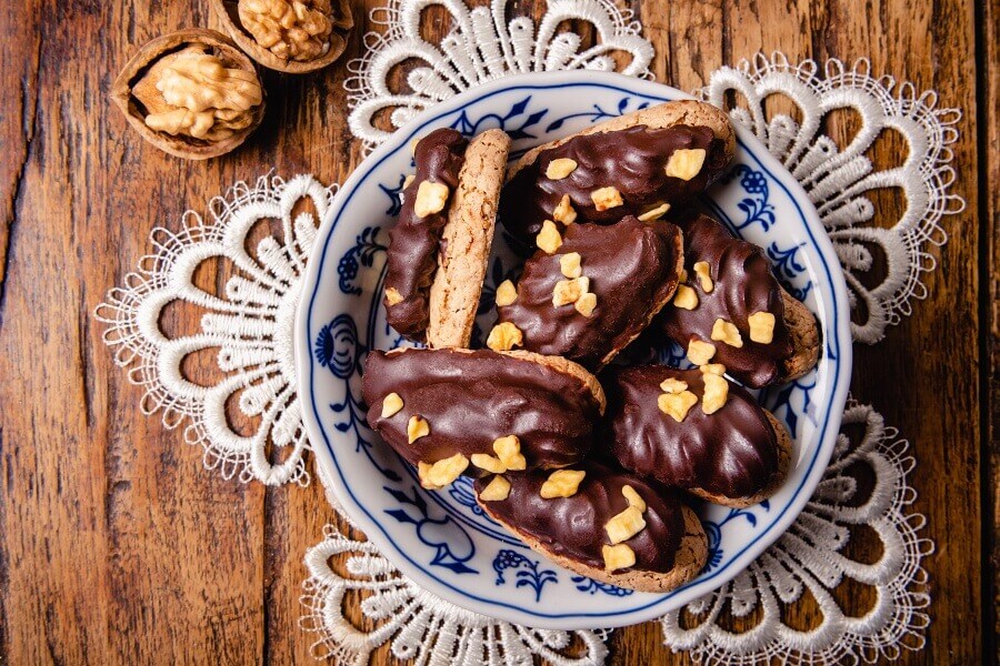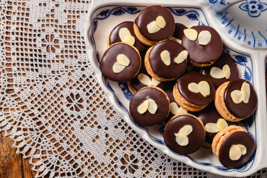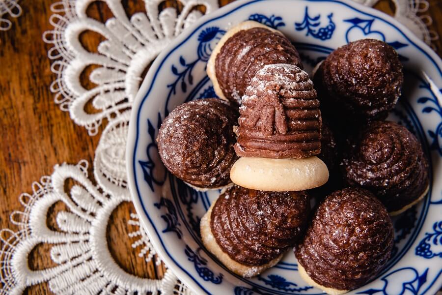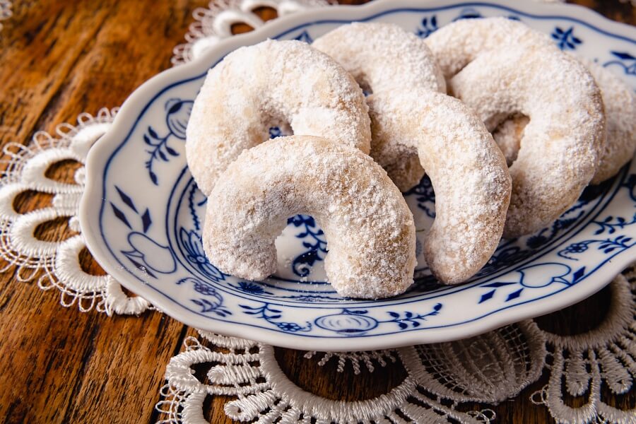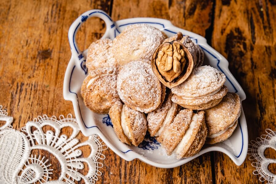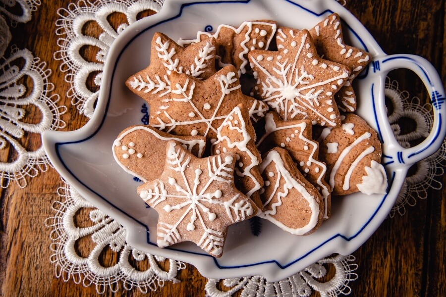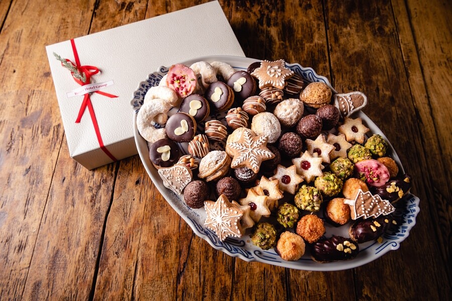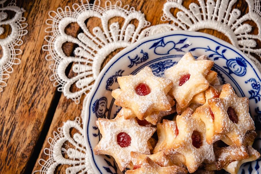 A mix of 10 types of Christmas sweets: Gingerbread, Coconut cookies, Vanilla rolls, Wasp's nests, Linzer dough, Christmas nuts, Išl cakes, Grilias sticks, Pistachio balls, Chocolate balls.