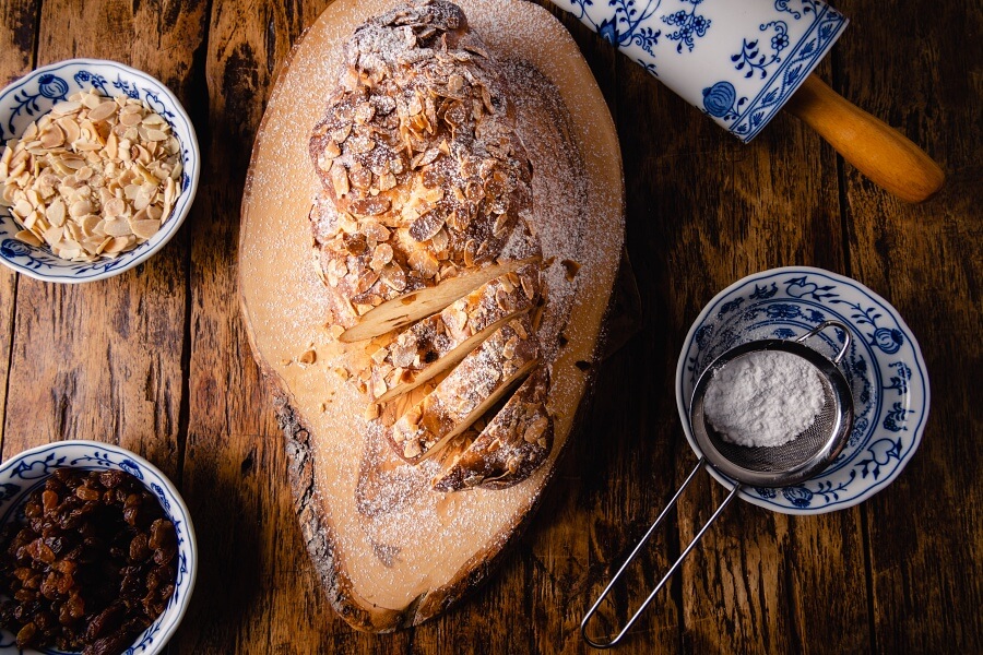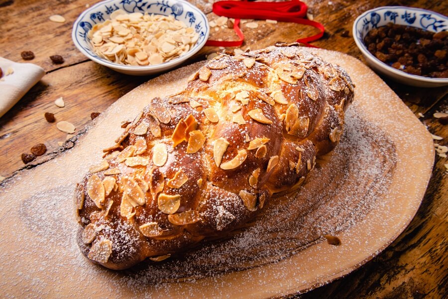 Naše vyhlášená poctivá Vánočka z másla s rozinkami uvnitř a lupínky mandlí na vrchu. Při výrobě používáme kvalitní suroviny včetně vajec z drůbeží farmy.